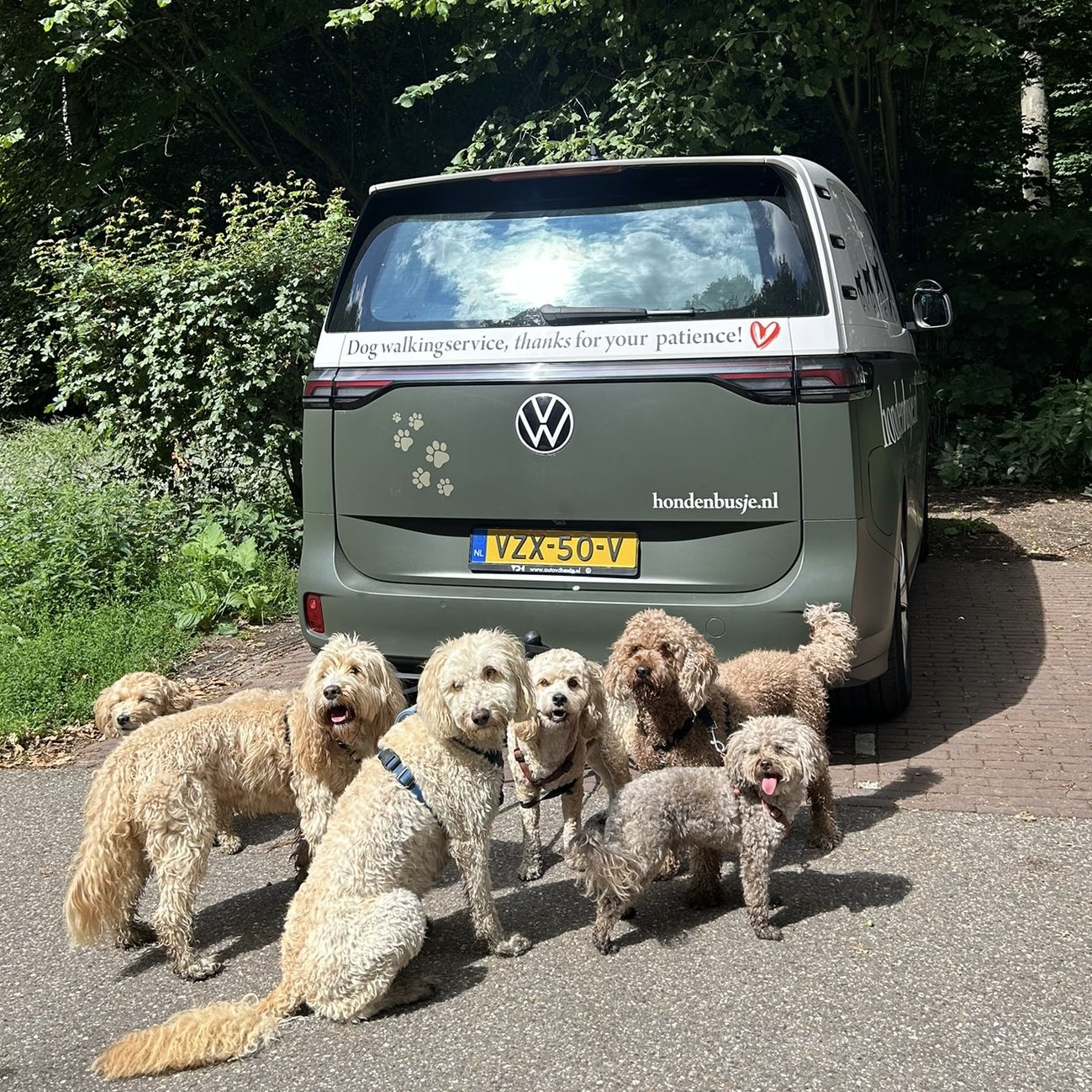 Elke hond krijgt zijn eigen goed passende tuigje aan met onze penning, zodat ze goed herkenbaar zijn in het bos, een GPS tracker wordt soms ook gebruikt. Onze gloednieuwe elektrische bus beschikt over airco plus een elektrische ventilator (voor de hete dagen bij stilstand) en natuurlijk is er altijd een bak vers water aanwezig.