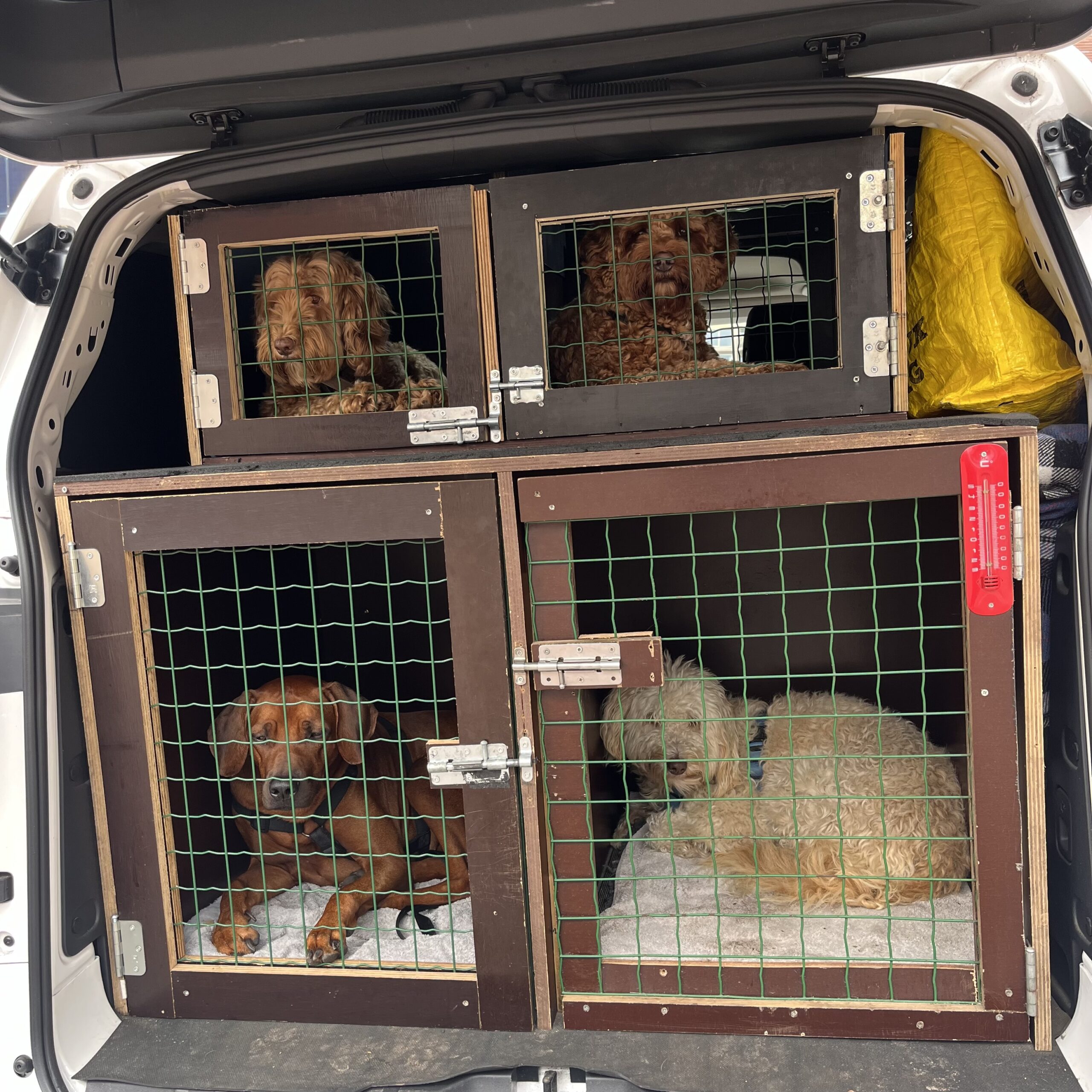 De hond wordt bij u thuis opgehaald en ook weer terug gebracht. Iedere hond ligt in zijn eigen hok op een lekker vetbed met een dikke handdoek erop, De honden wennen hier snel aan, ze krijgen ook altijd iets lekkers als ze na de wandeling allemaal weer in hun eigen hok gaan liggen. Dit is een hele rustige en veilige manier van vervoeren waardoor de reis van en naar het bos niet vervelend voor ze is.